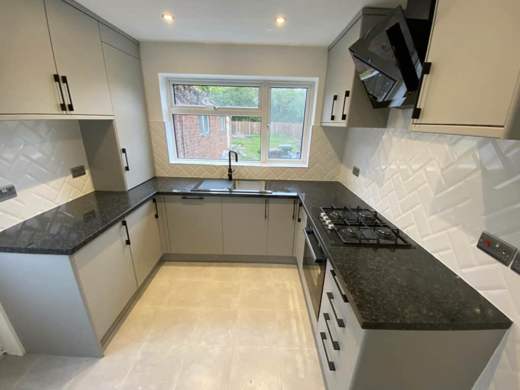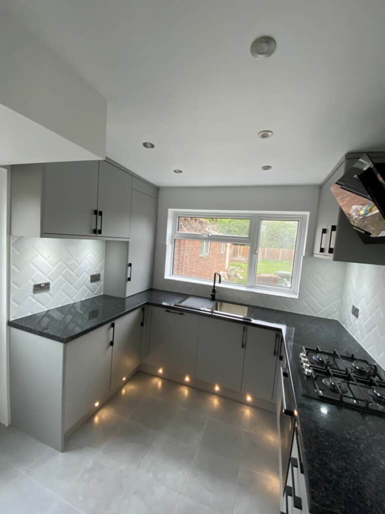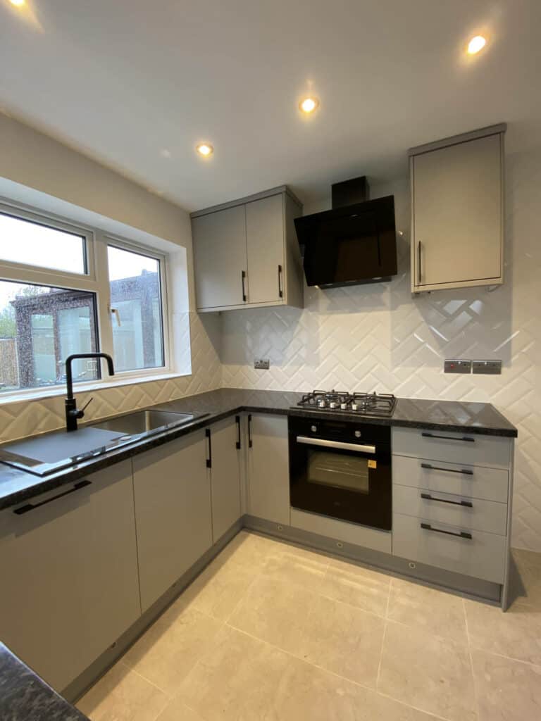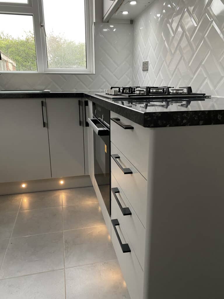 Unrecognisable! This kitchen has been completely transformed and now displays beautiful herringbone tiles with grey cupboards and LED lighting. Nicely designed, installed to a high standard and, as always, great attention to detail!